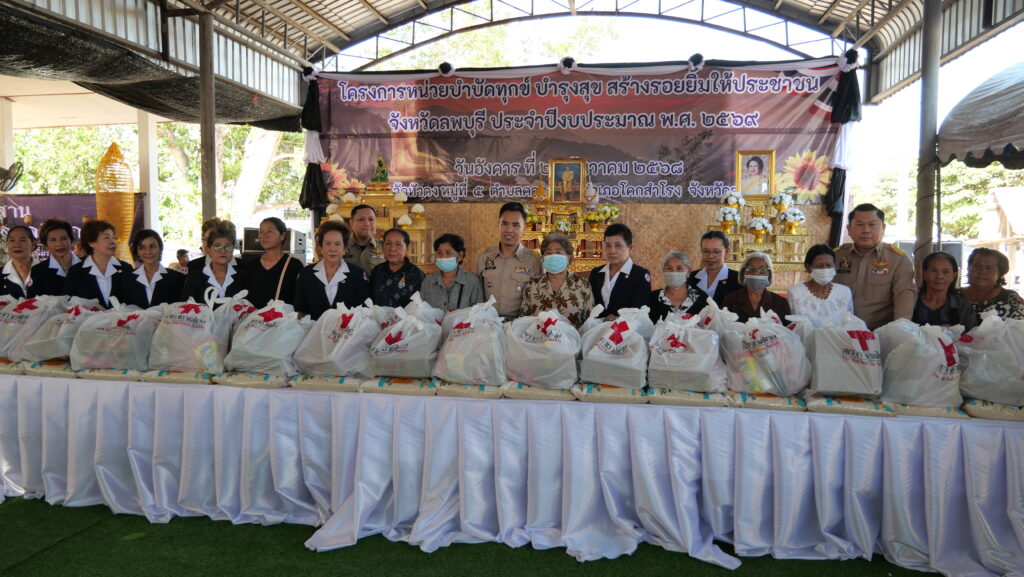 วันที่ 23 ธันวาคม 2568 นายวีรพงศ์ ฤทธิ์รอด ผู้ว่าราชการจังหวัดลพบุรี ณ วัดหัวดง ตำบลคลองเกตุ อำเภอโคกสำโรง จังหวัดลพบุรี พร้อมด้วยนายอำเภอโคกสำโรง และผู้นำปกครองท้องที่ รวมทั้งพี่น้องประชาชนคณะกรรมการเหล่ากาชาดจังหวัดฯ และหัวหน้าส่วนราชการประจำจังหวัดลพบุรี ออกหน่วยบำบัดทุกข์ บำรุงสุข สร้างรอยยิ้มให้ประชาชน ประจำปีงบประมาณ 2569 เพื่อบริการประชาชน รับฟังปัญหา ความเดือดร้อนและความต้องการของประชาชน ในการดำเนินการแก้ไขปัญหา ได้อย่างรวดเร็ว และตรงตามความต้องการอย่างแท้จริง นำความสุขรอยยิ้มมามอบให้กับพี่น้องประชาชนในพื้นที่ ในการนี้ พระครูใบฎีกาวัฒนา ถิตะวัฒนเมที เจ้าอาวาสวัดหนองข่อย เป็นประธานฝ่ายสงฆ์