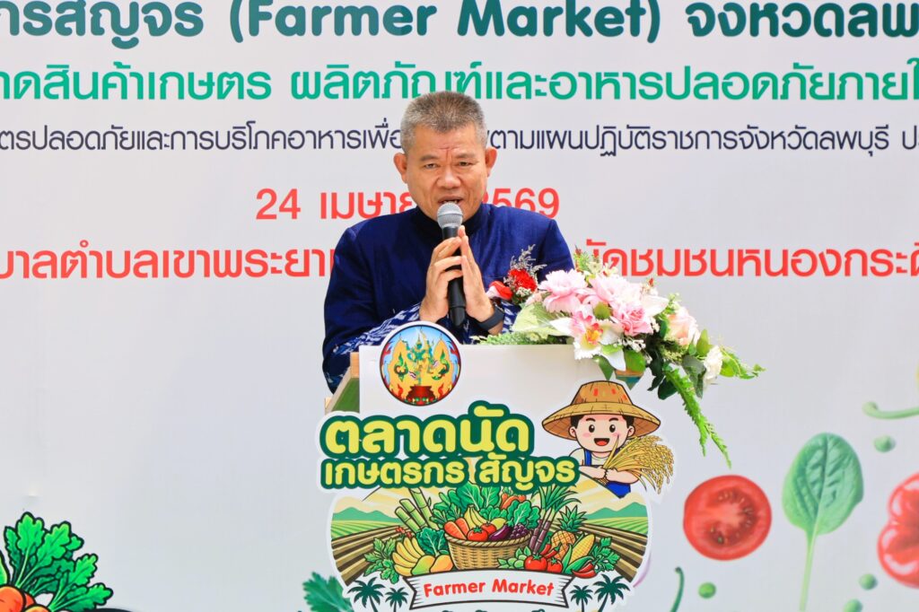วันที่ 24 เมษายน 2569 เวลา 10.30 น. ณ บริเวณเทศบาลตำบลเขาพระยาเดินธง อำเภอพัฒนานิคม จังหวัดลพบุรี ว่าที่ร้อยตรีทรงพล แป้นแก้ว รองผู้ว่าราชการจังหวัดลพบุรี เป็นประธานในพิธีเปิดงาน “ตลาดนัดเกษตรกรสัญจร (Farmer Market) จังหวัดลพบุรี ครั้งที่ 1”โดยมีวัตถุประสงค์เพื่อส่งเสริมและพัฒนาศักยภาพการผลิตและการจำหน่ายสินค้าเกษตรและอาหาร ปลอดภัย ให้สามารถเข้าสู่ช่องทางการตลาดได้อย่างมีประสิทธิภาพ อีกทั้งยังเป็นการประชาสัมพันธ์และสร้างการรับรู้เกี่ยวกับสินค้าเกษตรและอาหารปลอดภัยของ จังหวัดลพบุรีให้เป็นที่รู้จักอย่างแพร่หลาย ลดการพึ่งพาพ่อค้าคนกลาง ทำให้มีรายได้และโอกาสทางเศรษฐกิจให้แก่เกษตรกร ผู้ผลิต และผู้ประกอบการ ในพื้นที่เพิ่มขึ้น อย่างเป็นรูปธรรม